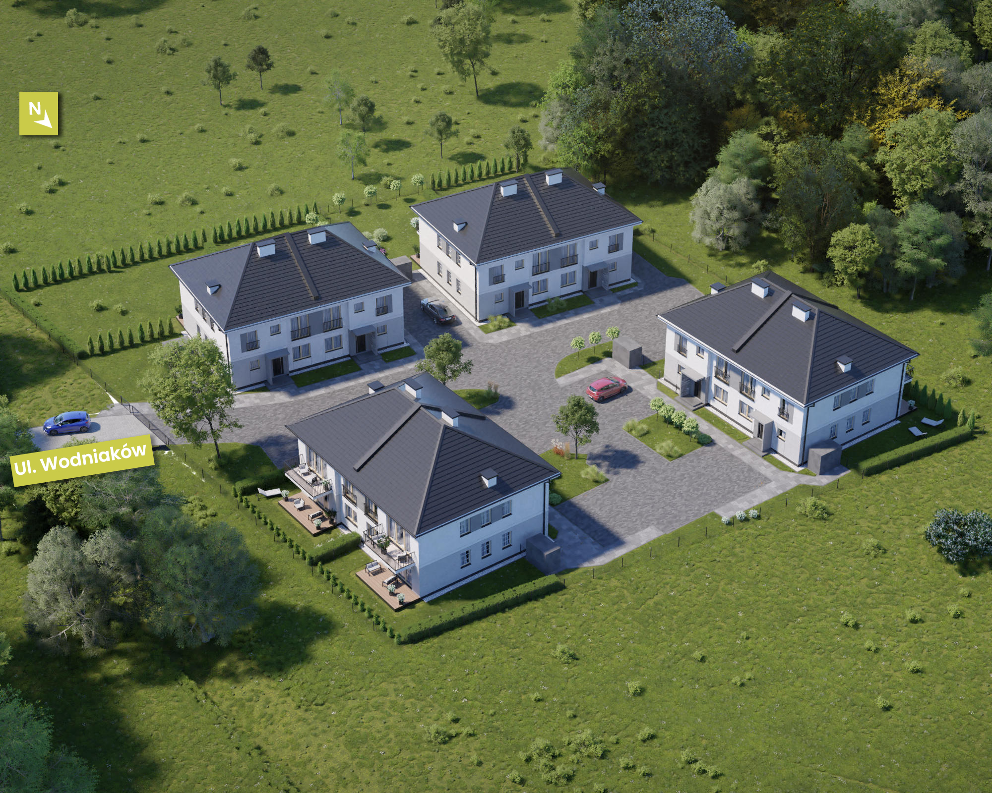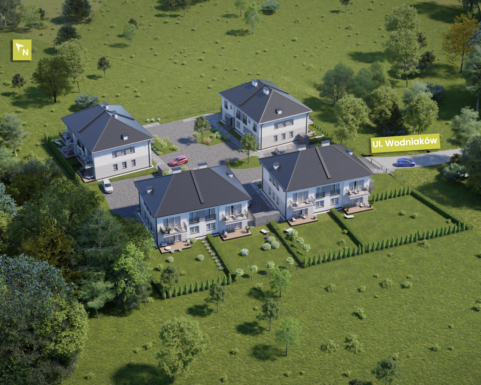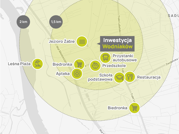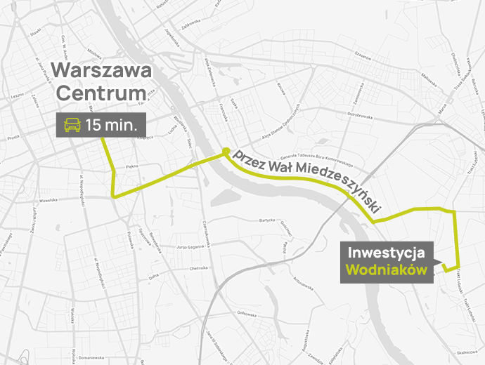 Zaciszne Ogrody przy ul. Wodniaków wyróżnia przede wszystkim doskonała lokalizacja. Wawer to jedna z najbardziej zielonych, ale także najlepiej skomunikowanych dzielnic Warszawy o bogato rozwiniętej infrastrukturze. Wygodny dojazd do centrum zapewnia bliskość Wału Miedzeszyńskiego, Trasy Siekierkowskiej, Południowej Obwodnicy Warszawy oraz Trasy Łazienkowskiej, a także znakomicie rozwinięta komunikacja autobusowa i Szybka Kolej Miejska. Do samego serca stolicy można dotrzeć w ok. 15-20 min.