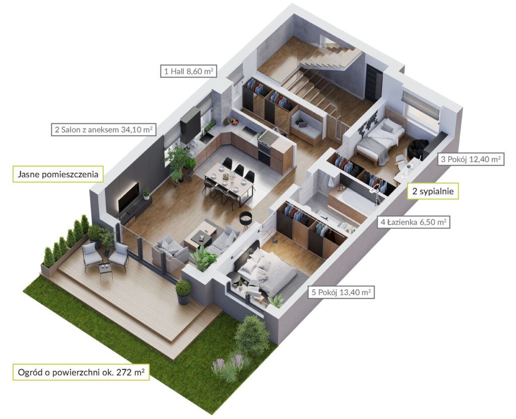 Zaciszne Ogrody w dobrym stylu łączą możliwość komfortowego wypoczynku w wygodnych wnętrzach z łatwym dostępem do bogatej infrastruktury stolicy. Kameralne osiedle obejmuje 16 apartamentów, usytuowanych w czterech nowoczesnych, funkcjonalnie zaprojektowanych budynkach w zabudowie bliźniaczej. Każdy apartament ma powierzchnię 75 m² – mieści przestronny salon z aneksem kuchennym, dwie sypialnie, hol z miejscem na duże szafy oraz łazienkę. Mieszkania na parterze mają dostęp do indywidualnych ogrodów o powierzchniach od 60 m² do 416 m².